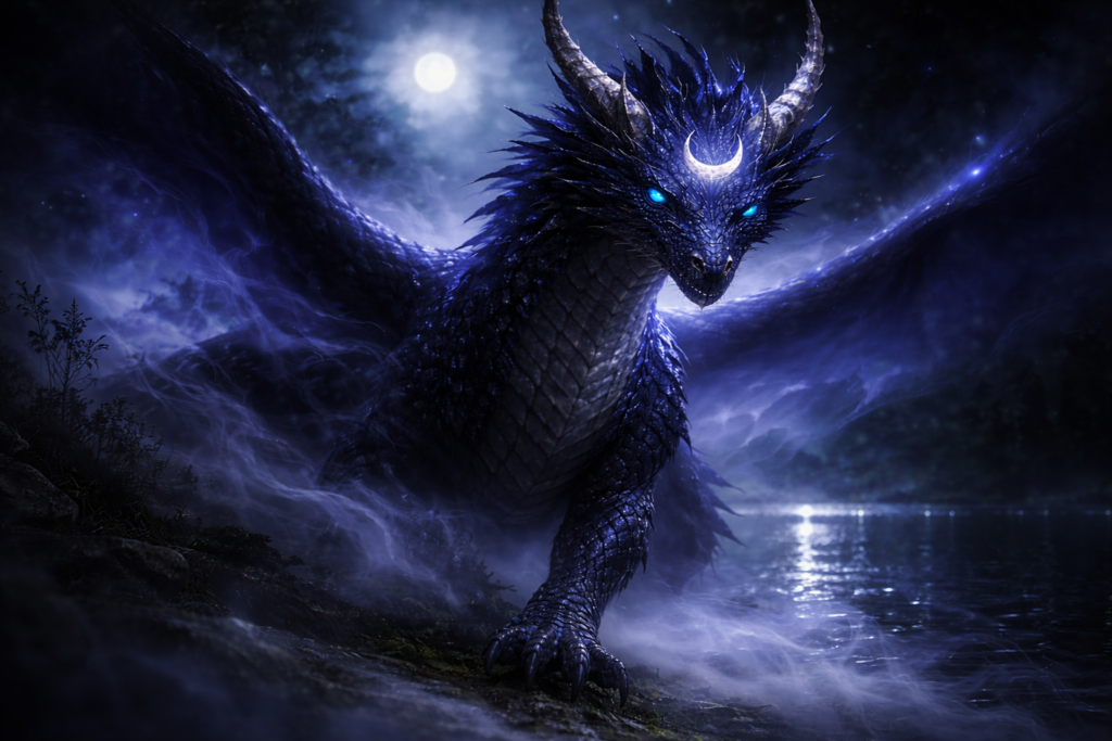 Belíssimo dragão azul-marinho escuro, olhos de cor azul ciano e belíssimos chifre chumbo prateado. No centro da testa vejo uma belíssima lua crescente prateada, com suas pontas para cima. Quando se apresenta na matéria física, suas escamas são grossas e muito intensas, podendo ser sentida a energia de seu poderoso fogo de transmutação das sombras do coração.